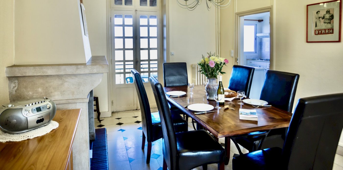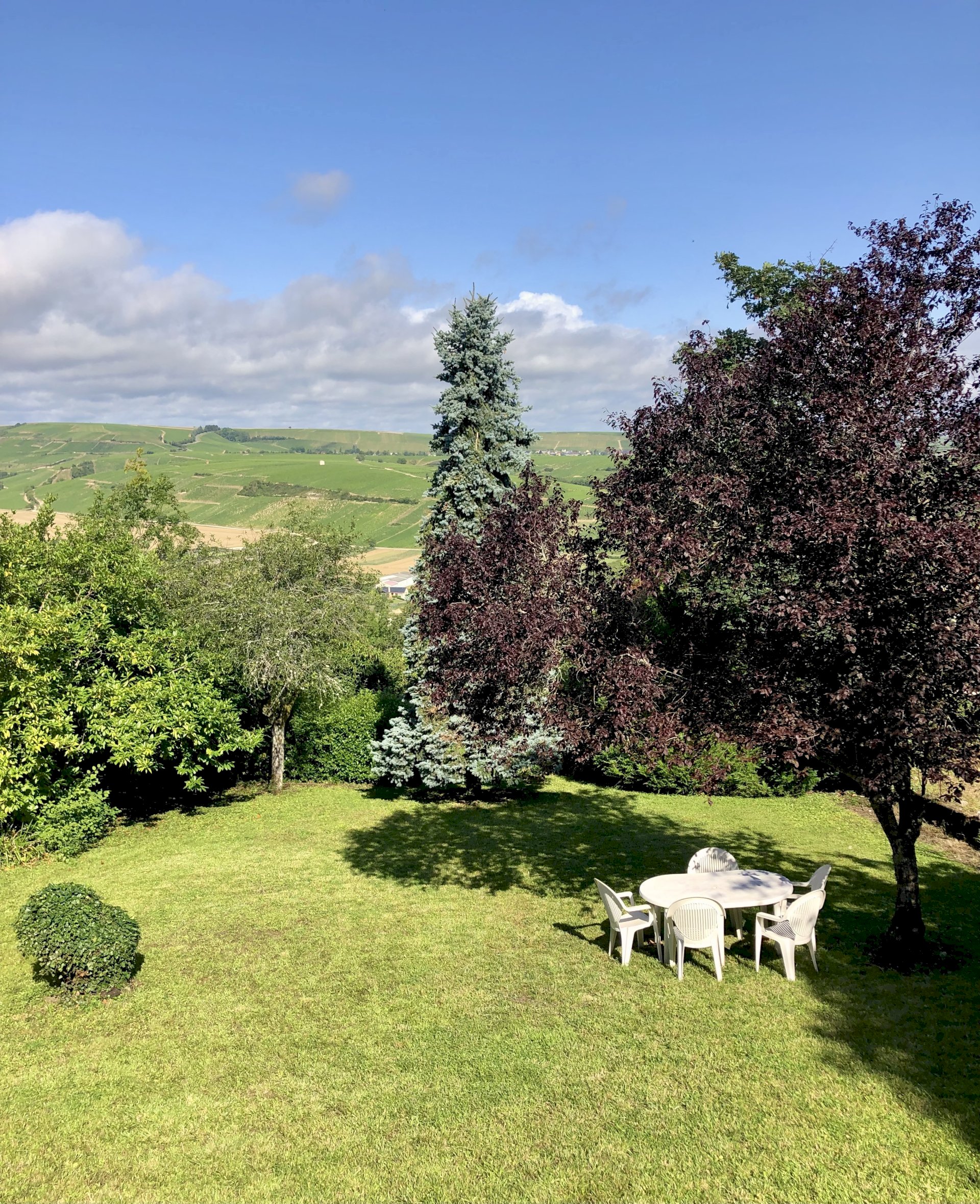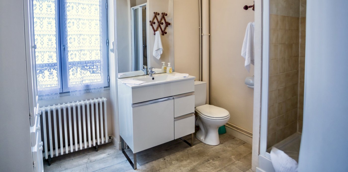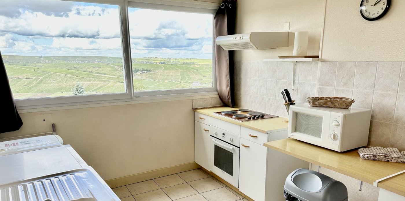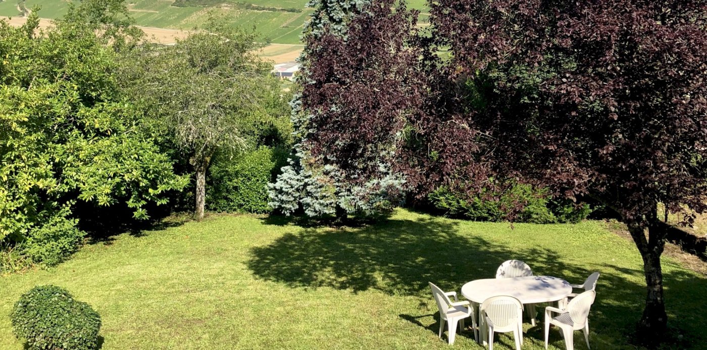 This bright and spacious 2 bedroom / 2 bathroom apartment is on 2 floors and has a large backyard. Windows everywhere provide a “belle vue” of Sancerre's famous vineyards. A stone fireplace and black and white floor tiles add grace to this comfortable apartment. French doors lead to a terrace with splendid vineyard views and to a walled private garden below.