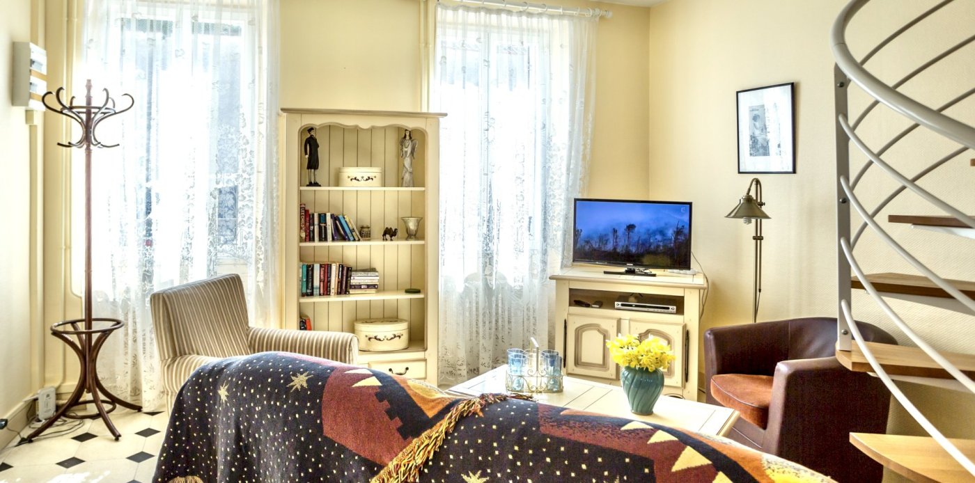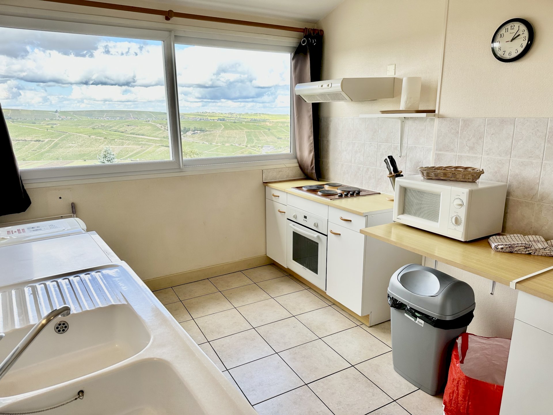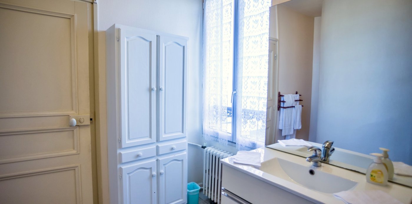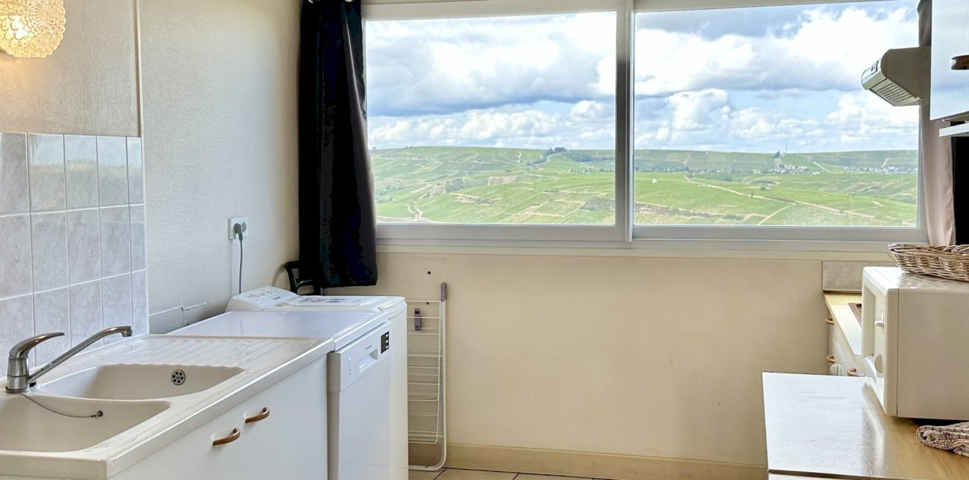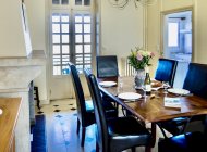 This bright and spacious 2 bedroom / 2 bathroom apartment is on 2 floors and has a large backyard. Windows everywhere provide a “belle vue” of Sancerre's famous vineyards. A stone fireplace and black and white floor tiles add grace to this comfortable apartment. French doors lead to a terrace with splendid vineyard views and to a walled private garden below.