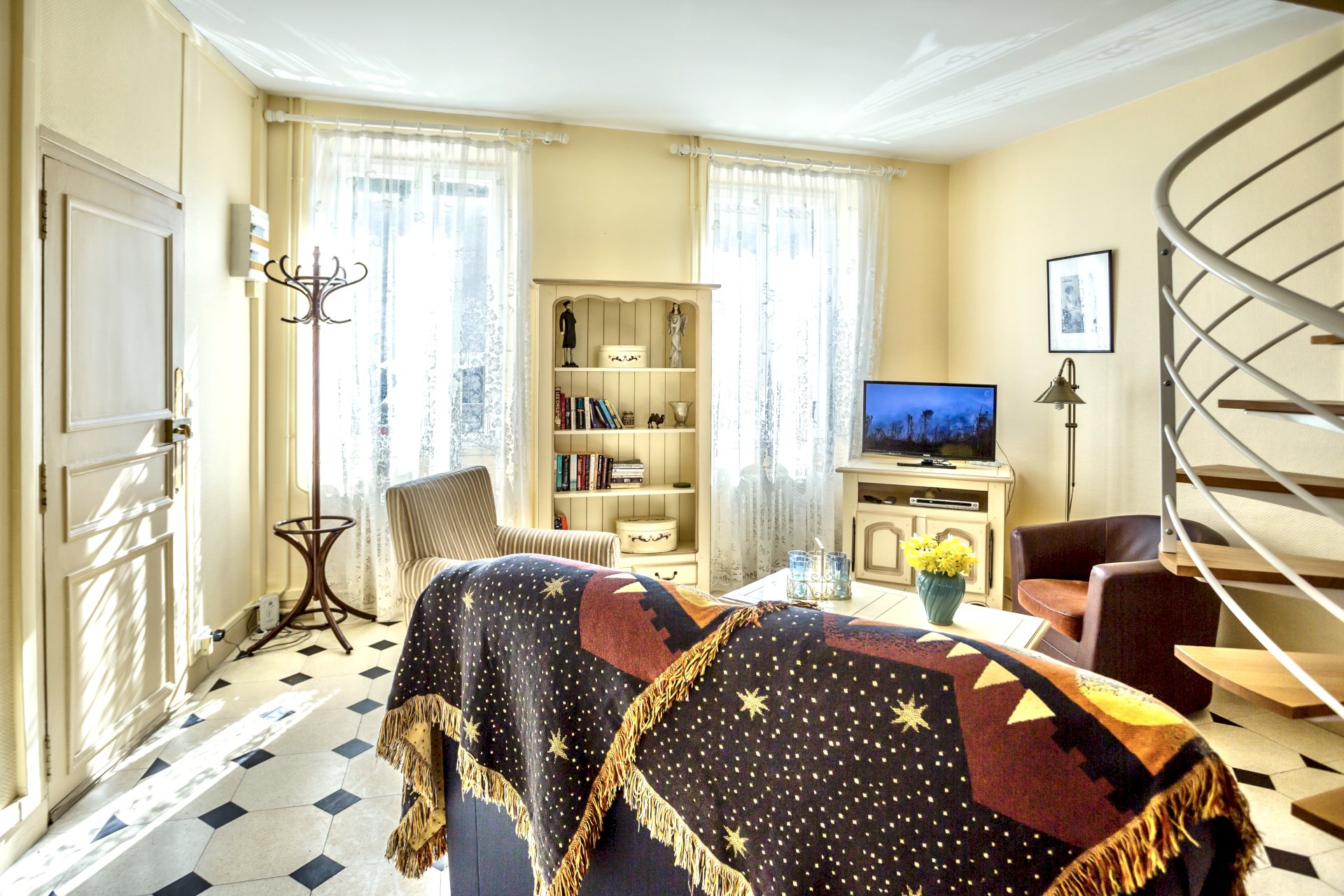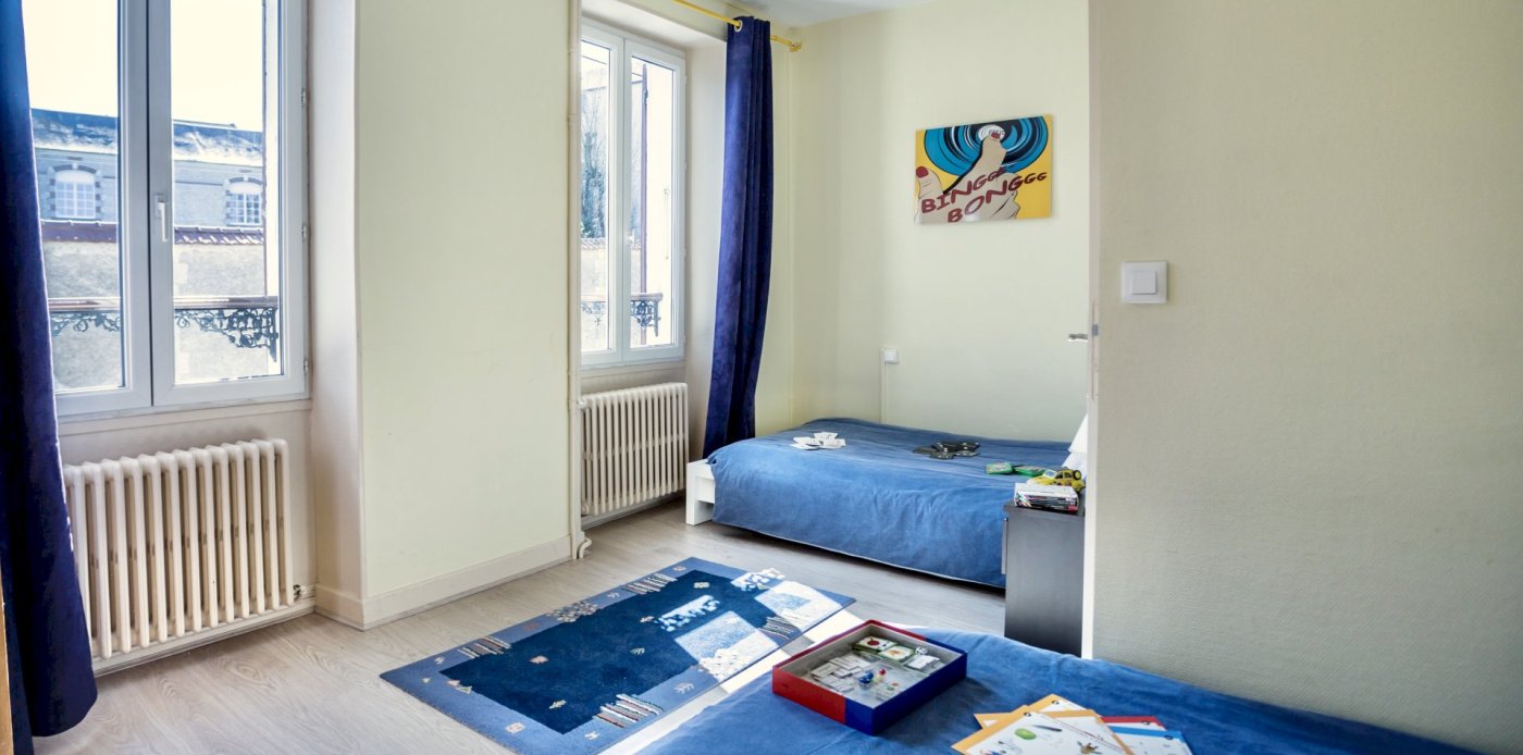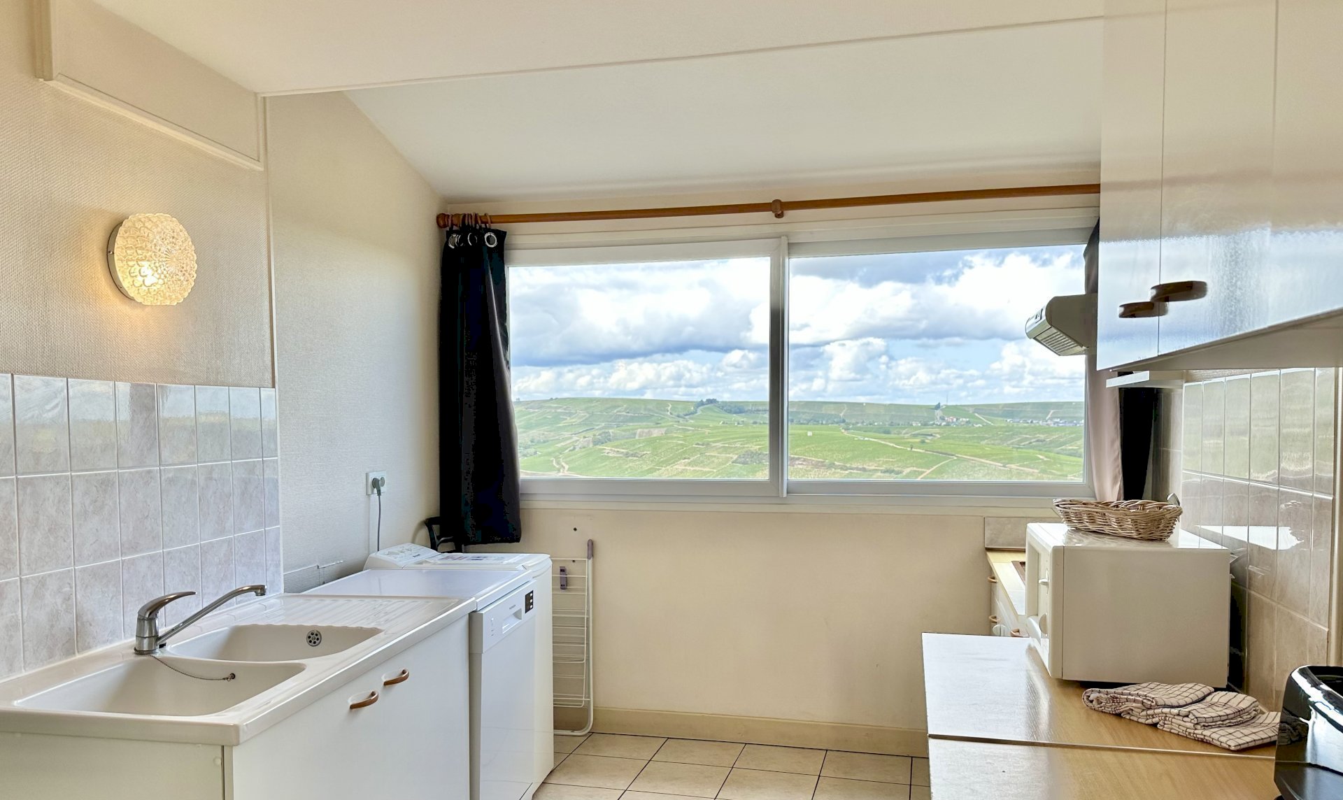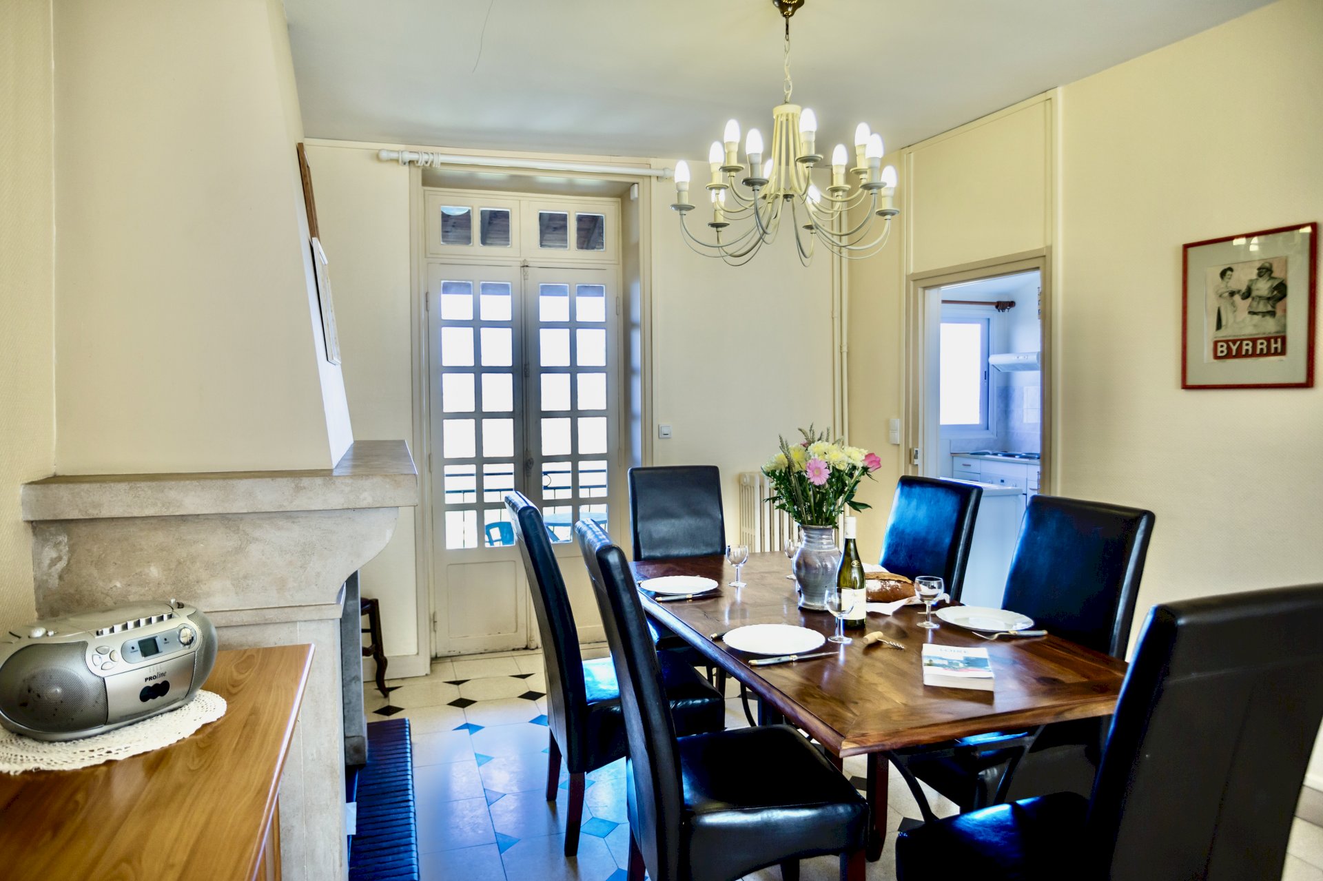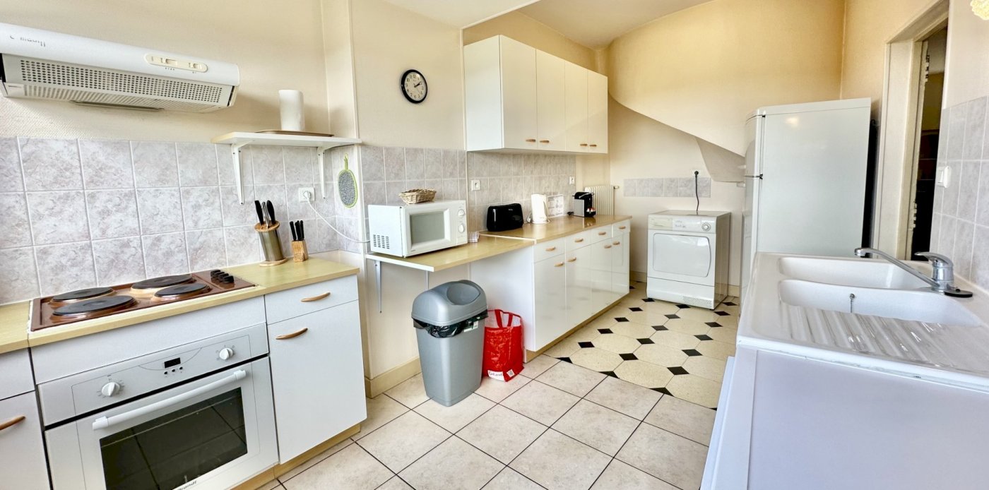 This bright and spacious 2 bedroom / 2 bathroom apartment is on 2 floors and has a large backyard. Windows everywhere provide a “belle vue” of Sancerre's famous vineyards. A stone fireplace and black and white floor tiles add grace to this comfortable apartment. French doors lead to a terrace with splendid vineyard views and to a walled private garden below.