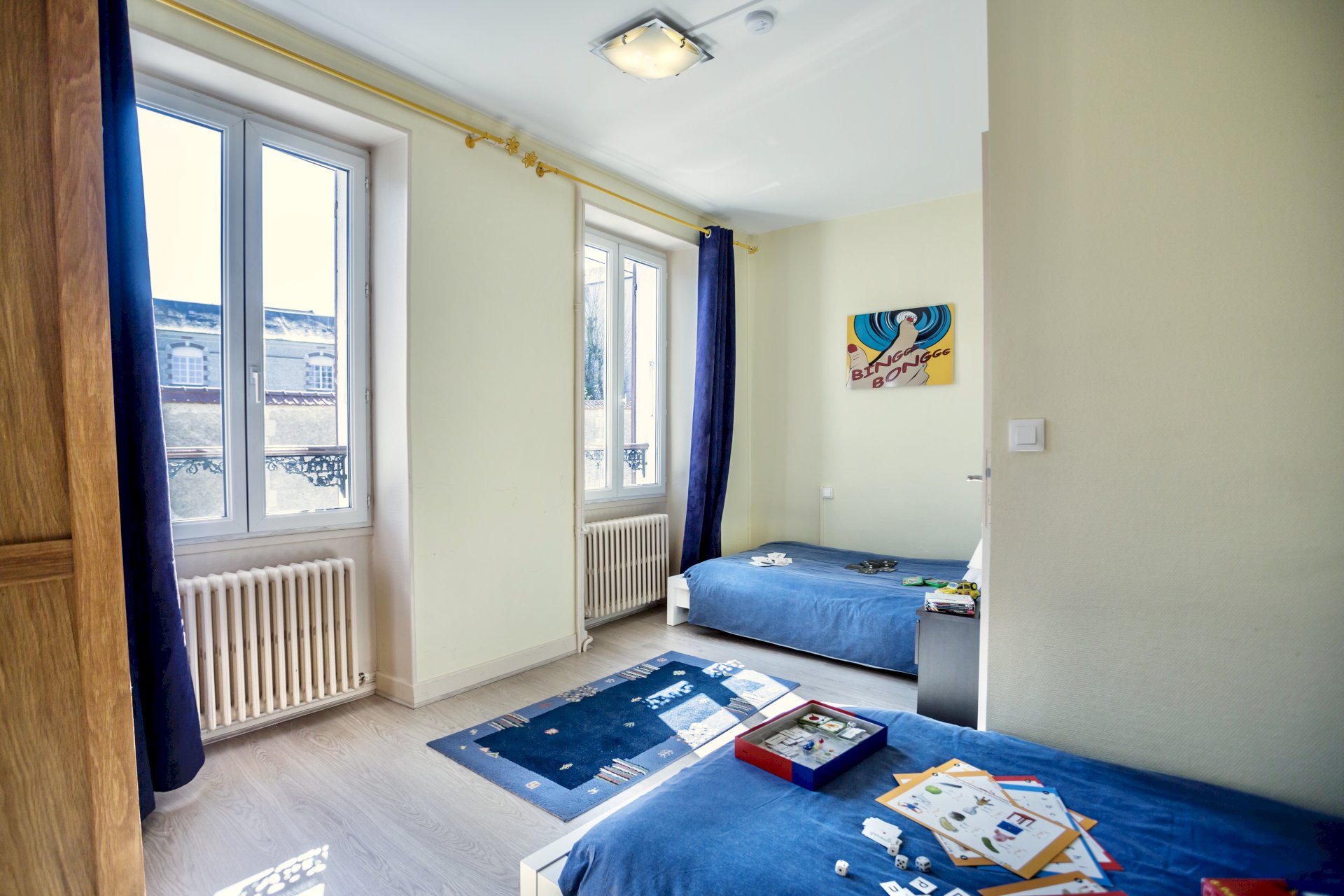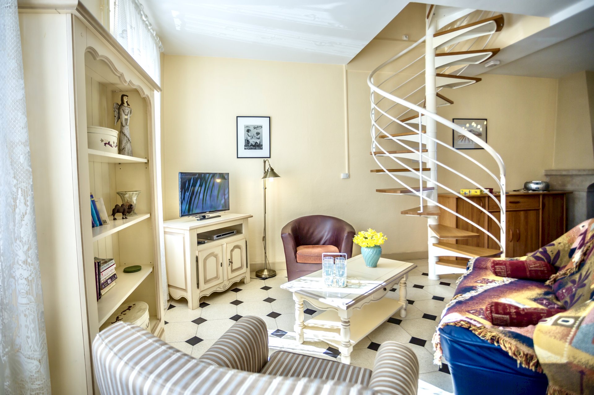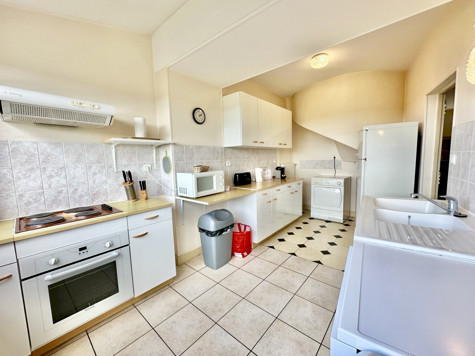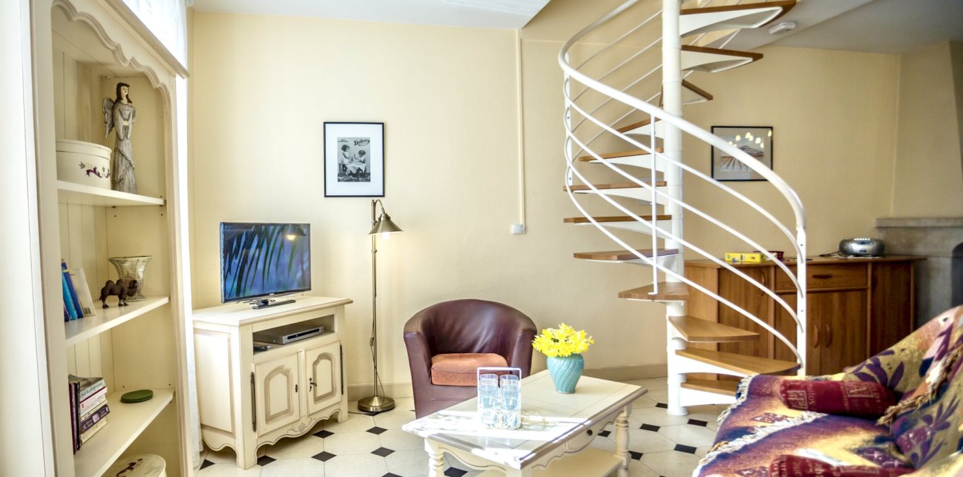 This bright and spacious 2 bedroom / 2 bathroom apartment is on 2 floors and has a large backyard. Windows everywhere provide a “belle vue” of Sancerre's famous vineyards. A stone fireplace and black and white floor tiles add grace to this comfortable apartment. French doors lead to a terrace with splendid vineyard views and to a walled private garden below.