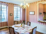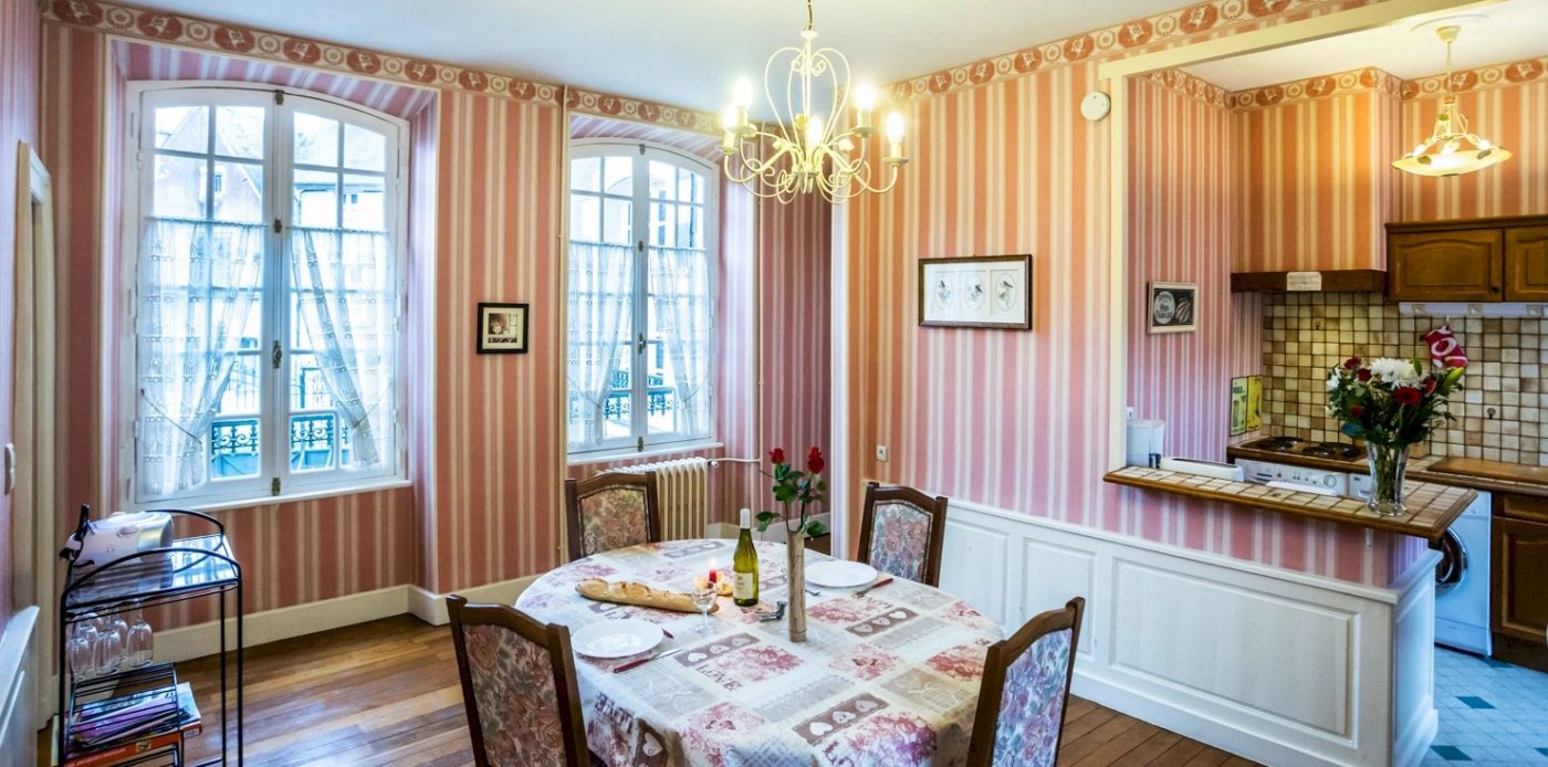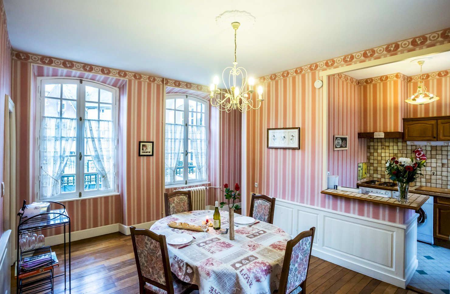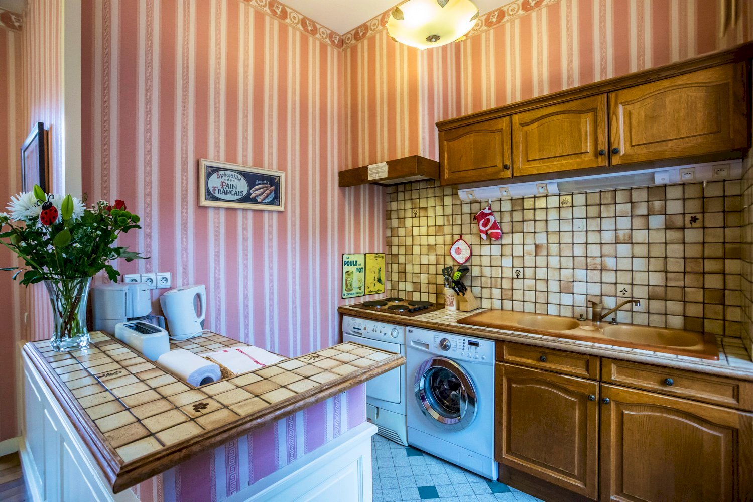 This romantic 550 square feet (51 M2) residence is ideal for a couple seeking both privacy and space. An enormous bedroom with oak wainscoting has 2 double beds. A 19th century stained glass chandelier graces the foyer. A full-sized kitchen has everything you need. A washing machine and dryer are provided. Modern bathroom has full-sized shower. There are beautiful views from every window of the half-timbered houses surrounding the square and the landscaped courtyard below.